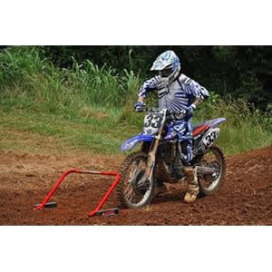 The Holeshot is a completely random timed, electronic, wireless, practice starting gate. This innovative product allows riders to independently practice their starts. When the rider presses the wireless remote button mounted on their crossbar pad, it will activate a computer controlled timing sequence which will drop the gate randomly. After the remote button is pressed a green LED will illuminate on the gate. This lets the rider know the gate has recieved the signal and gives the rider 2 seconds to get his or her hands back on the bars. The LED will then turn red and start blinking. When it starts blinking it is like the 30 second board turning sideways. Get ready becuase the gate will now drop randomly between 1-5 seconds, just like an AMA Pro National. Resetting the gate is as easy as riding by and stepping on the backside of the hoop without dismounting. Multiple gates can be electronically linked for multi-racer, bar banging practice. Simply plug multiple gates into each other using the supplied linking wire and all the gates will drop at the same time using a random timed signal from one remote button. The Holeshot also has a new Instant Drop feature. If you are using a trainer, parent or riding buddy to practice your starts and want to bypass the random timing sequence in order to control the drop sequence, you can plug the remote button directly into the gate. Simply plug the 6 foot long cable supplied with your gate directly into the remote button and into the ride side of your gate. This will automatically eliminate the wireless signal and random sequence. The gate will drop as soon as the button is pressed.