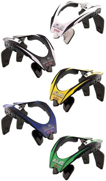 This is the world's first racer designed, racer tested and flexible Neck Brace that provides the ultimate mobility, comfort and style. Simply lower the brace over your head, no flimsy clips or fasteners are required. It has 3 axis adjustability by height, length and width (wide body kit sold separately). Open frame design allows the brace to flex upward and downward for improved comfort and mobility. ERS (Emergency Release System) provides a safe, one of a kind removal system after a severe crash. Performed in 3 simple steps, with no head or neck movement required. Dual pivoting back supports provide added surface area to safely transfer impacts, and is designed to transfer the impact away from the spine, not through it. Open sternum area designed to help transfer the impact around the sternum, reducing the risk of a fracture. Flexible leaf spring design chest supports work like suspension, allowing a controlled stop during hyper flexion impacts. Exclusive pivoting chest and back supports self adjust to the body and fold for easy storage. High strength polycarbonate construction is impact and shatter resistant, produces a vibrant finish and easily accepts custom graphics. Specifically designed padding uses unique material properties, to help disperse the energy from an impact before it reaches the body, further reducing smaller injuries such as bruising or muscle fatigue. All padding is water resistant. No more wet, heavy, waterlogged padding in moto races. Optional dual layer shoulder padding offers adjustable height settings, along with a better fit. Fully custom anodized 6061 T6 aluminum hardware and back support mounts. Interchangeable aluminum back support mounts allow length adjustment. Only brace to offer 3 mounting options out of the box. 3 options include full chest strap under the arms cross straps, or stand alone brace with no straps. Included: 1 atlas brace, 1 extra set of back support mounts, 2 strap systems, 1 draw string brace bag and user manuals.